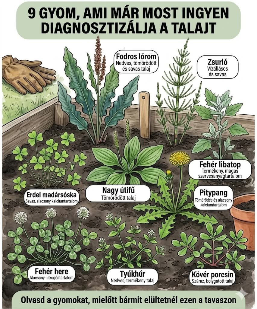 A zsurló gyakran vizenyős, savanyú talajra utal, míg a nagy útifű és a pitypang sokszor tömörödött földben érzik jól magukat. Ha megtanulod „olvasni” ezeket a jeleket, ingyenes talajtesztet kapsz: segítenek eldönteni, szükség van-e lazításra, komposztra, meszezésre vagy épp jobb vízelvezetésre. Figyeld meg, mi nő magától, és alakítsd úgy a kertedet, hogy a talaj és a növényeid is fellélegezhessenek.